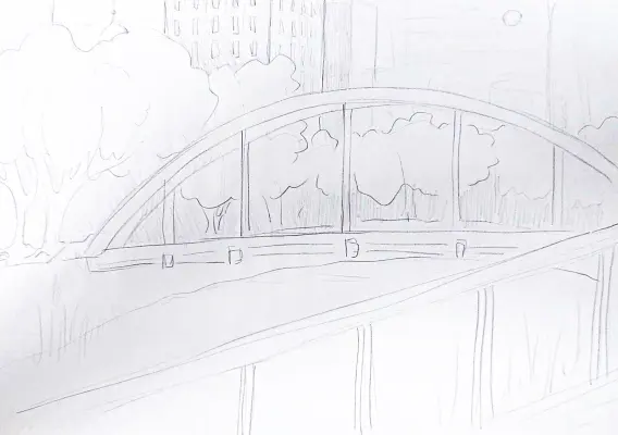 Моя работа выполнена простым карандашом. На ней мне хотелось показать, насколько красив Черкизовский парк, пешеходный мост, а также деревья, которые окружают всё это.