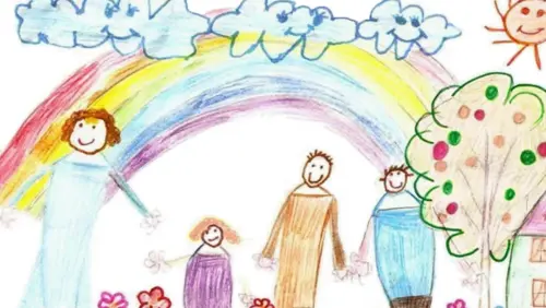 Представьте себе уютный домик, окруженный зелеными деревьями и яркими цветами. У него есть теплая крыша и окна, через которые светит солнечный свет. Перед домом веселая семья — мама, папа и дети, которые играют на траве. У всех яркие улыбки и радостные лица, они наслаждаются временем, проведённым вместе. Рядом может стоять собака, виляющая хвостом, и несколько птичек, летающих в небе. Этот рисунок передает атмосферу счастья и уюта.