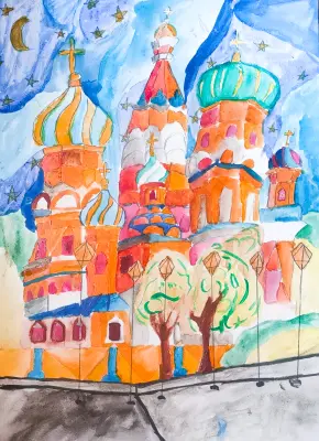 Работа написана акварелью, когда я гуляю по Красной площади, всегда обращаю внимание на этот необычный и невероятно красивый храм, а когда я посмотрела мультфильм об истории его возникновения, о святом Василии Блаженном, он мне начал нравиться еще больше.