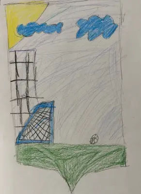 Мой двор и мой любимый футбол. У нас во вдоре установили в этом году новую футбольную площадку — целое поле с хорошим покрытием. Теперь это одно из моих самых любимых мест во время прогулки. Мы собираемся с друзьями и вместе играем, соревнуемся и учимся дружить и поддерживать друг друга. Я люблю мой район и рад тому, что живу прямо рядом с парком Ручеек. На рисунке то самое футбольное поле. Спасибо.
