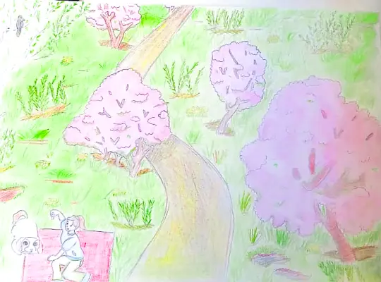 Я нарисовала наш замечательный, удивительный яблоневый сад! Место просто необыкновенное весной, когда все деревья цветут! Всё вокруг белое, душистое. Очень вдохновляет и повышает настроение!