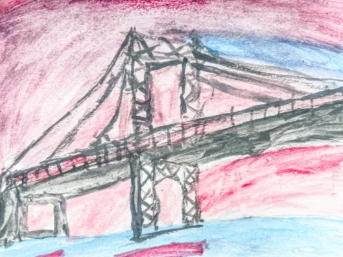 Моя работа выполнена акварельными красками. Я очень люблю рисовать, и один из моих любимых сюжетов – железнодорожный мост . Когда я изображаю его на бумаге, мне кажется, будто я сам становлюсь инженером, строителем или даже машинистом поезда, который мчится по этому мосту.