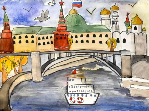 Вид на набережную Москвы. На прогулке по Москве-реке особенно запомнился Большой Каменный мост. Работа выполнена на формате А2, акварелью и чёрным маркером.