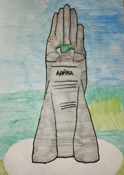 Памятник собаке Лайке (первой собаке-космонавту) я нарисовала фломастерами. Памятник можно увидеть на территории Института военной медицины (метро «Динамо»).