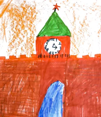Работа выполнена восковыми мелками. На рисунке изображён Кремль: высокие красные стены с зубцами, как у сказочного замка. На башнях сверкают золотые звёзды, а на главной башне – большие часы.