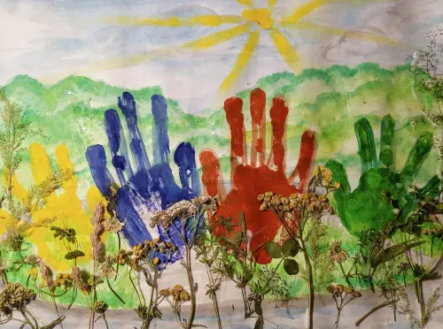 В своей работе я изобразила цветущую центральную площадь нашего парка 50-летия октября, Площадь семьи, точнее, какой она была совсем недавно. На площади, до этого лета, находились самые узнаваемые символы парка - инсталяции «Ладони», 4 разноцветные ладошки, как символы семьи. Сейчас их убрали, но нам они очень нравились. Помогали мне мои братья (8 и 3 года), это их ладошки на рисунке. Мы очень надеемся, что руки великанской семьи вернутся на площадь!