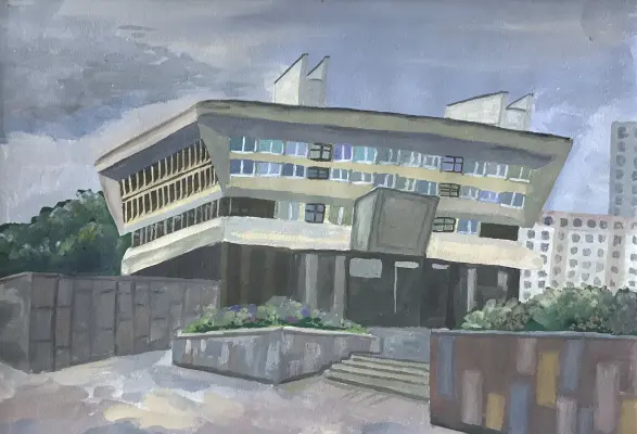 На работе изображено здание Префектуры города Зеленограда со стороны Центральной площади и Парка Победы. Автор хорошо передал монументальность и величественность здания.