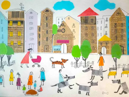 Работа создана в смешанной технике: коллаж на бумаге с добавлением рисунка линерами. Материалы: газета, цветная бумага, линеры. В нашем дворе всегда гуляет много детей, проходит много людей и собак.