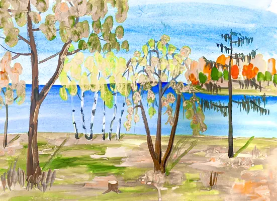 Я нарисовала Белое озеро осенью. Озеро очень красивое. Осенью листья становятся оранжевыми, красными и желтыми. Я люблю яркие краски. И люблю гулять у озера.