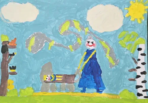 На моей работе нарисовано, как моя мама гуляет в парке возле дома. В коляске мой маленький братик. А я их рисую . В парке очень красиво и солнечно, есть белочки, которых я нарисовала.