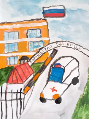 На рисунке изображена Вороновская больница, в которой открыты двери для лечения детей и взрослых. История Вороновской больницы началась в марте 1876 года с открытия лечебницы в селе Вороново. Сегодня - это стационар с 4 отделениями, поликлиникой и отделением паллиативной помощи. В следующем году наша больница будет отмечать 150-летие. Рисунок выполнен акварелью и гуашью.