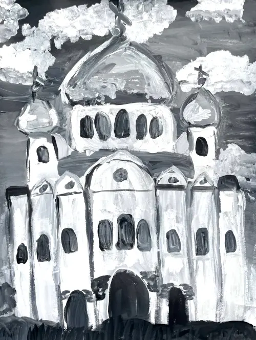 На рисунке я решила изобразить Троицкую церковь, которая находится в нашем районе. Я давно хотела запечатлеть её красоту на бумаге. Церковь возвышается над окружающими домами, словно устремляясь в небо. Её купола, украшенные золотыми крестами, блестят на солнце, создавая ощущение лёгкости и возвышенности. Я постаралась передать на рисунке не только архитектурные особенности здания, но и атмосферу спокойствия и умиротворения, которая царит вокруг.