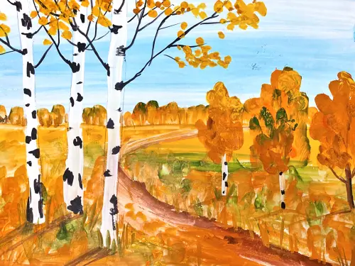 Осень в нашем любимом Салтыковском лесопарке такая красивая! Я нарисовала три золотые берёзки возле дороги, которая идёт прямо через большую солнечную полянку к густому лесу вдали. Там много разных листиков жёлтых, оранжевых и красных, они похожи на яркие конфетки, рассыпанные повсюду.