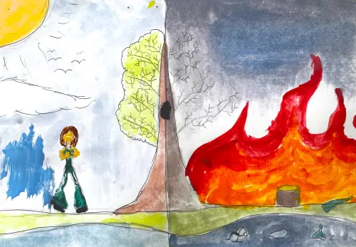 На этой картине я воплотила две идеи! Я нарисовала наш район, а также показала экологическую проблему. В нашем районе есть большой и красивый лес, но люди часто пренебрегают правилами и загрязняют его. Берегите лес!
