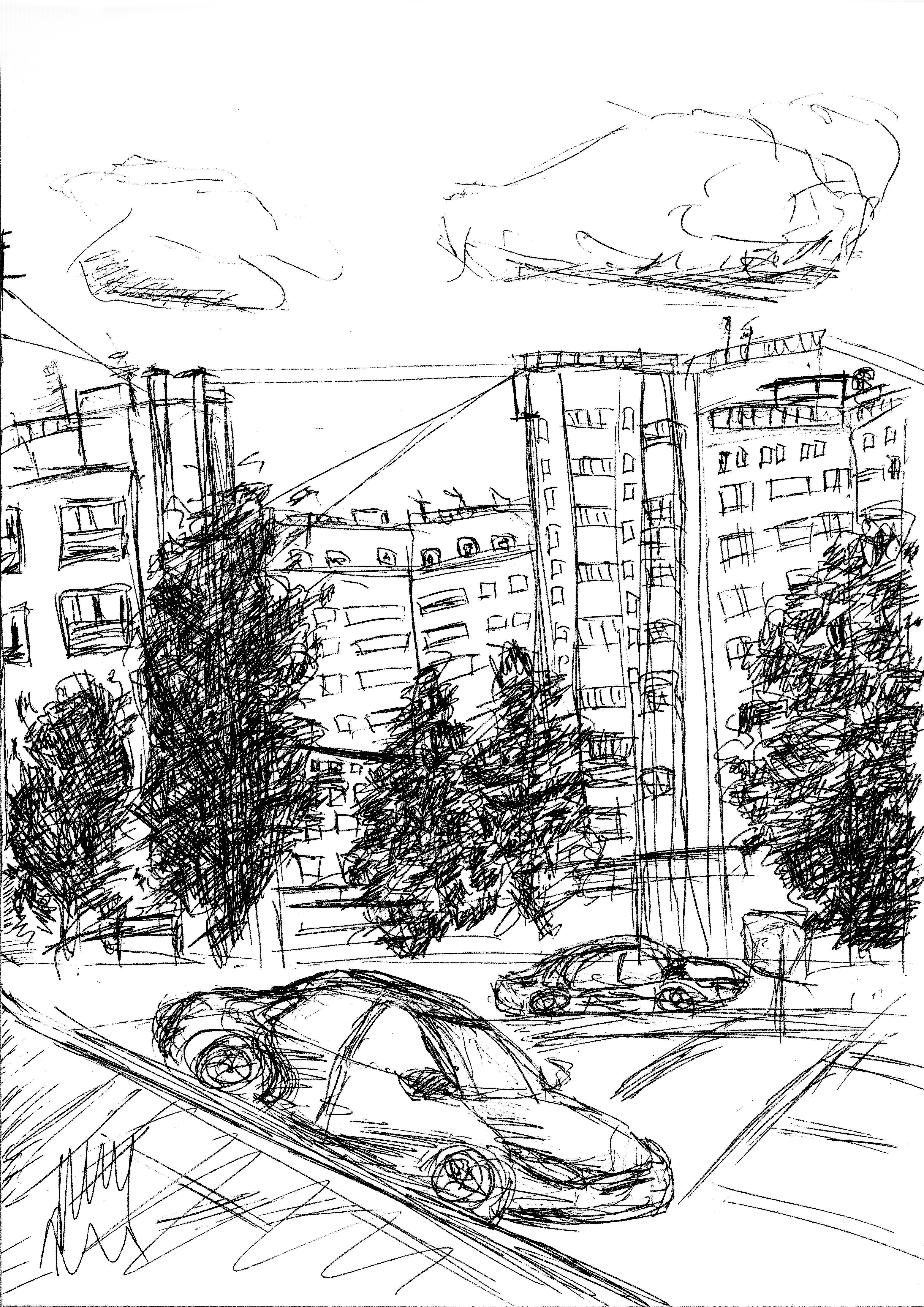 Вид на наш Ясный проезд из окна. Люблю наблюдать, как ездят машины. Я тоже езжу с родителями по этим дорогам. А еще там деревья, которые защищают нас от пыли летом.