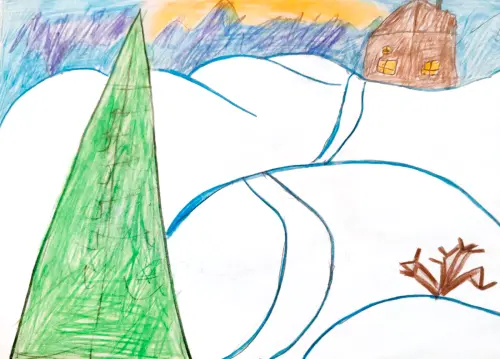 На картинке изображена зимняя сцена, наполненная теплом и уютом. В центре внимания — небольшой домик, уютно устроившийся среди заснеженных холмов. Его окна светятся теплым жёлтым светом, создавая ощущение домашнего уюта и тепла. Рядом с домом виднеется зелёная ёлка, которая, несмотря на зимний пейзаж, сохраняет свой цвет и добавляет немного яркости в картину.