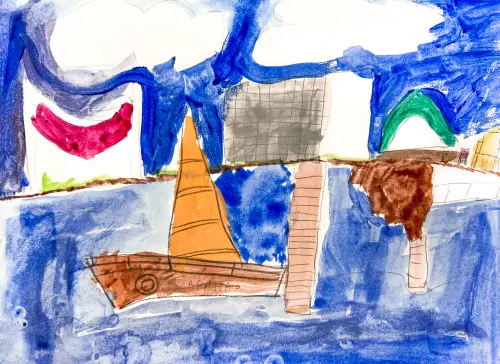 Моя работа выполнена акварелью. Я нарисовала парусник на реке Москва, вдали виден пляж с местами отдыха, причал, небо с прекрасными огромными облаками.
