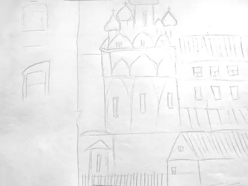 На картинке изображен город, который выглядит по-настоящему сказочно. В центре находится большой замок с высокими башнями и острыми шпилями. Рядом стоит совсем маленький, старенький домик. И, конечно, многоэтажка. Все это показывает, насколько Москва разная.