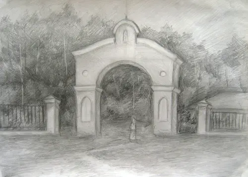 Графическая работа. Это пленэрная работа — зарисовка каменных ворот в стиле псевдоготики, ведущих на территорию Храма Святителя Николая Мирликийского.