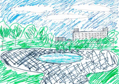 На рисунке изображён уютный сквер с круглым фонтаном, из которого весело бьют прозрачные струйки воды. Вокруг фонтана растут пышные зелёные деревья с густыми кронами, отбрасывающими тени на аккуратные дорожки. На заднем плане возвышается высокий многоэтажный дом с большими окнами, отражающими солнечный свет. Вся сцена наполнена яркими летними красками и выглядит очень мирно и приветливо.