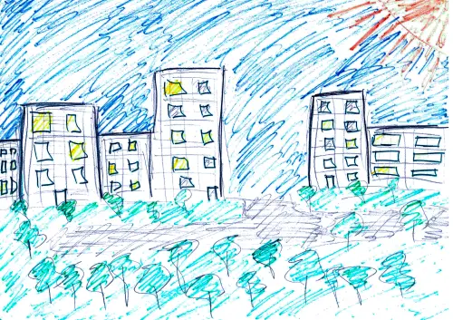 На рисунке изображён вид из окна на уютный спальный район города. Аккуратные многоэтажные дома стоят вдоль зелёных дворов. Во дворах видны детские площадки и дорожки между деревьями. Картина передаёт спокойную и тёплую атмосферу городского утра.