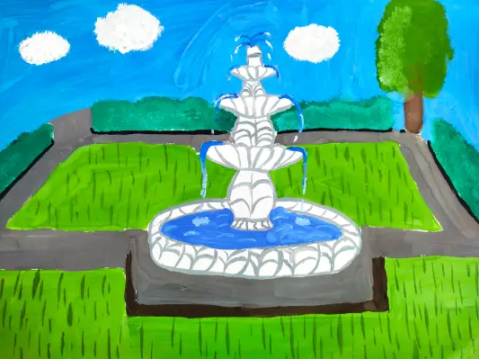 Изящный фонтан, рядом с которым так приятно прогуляться знойным летним днём и полюбоваться на лучики солнца, играющие в прозрачных водяных струйках. Бумага, гуашь.