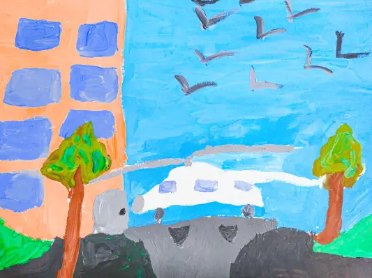 На высоком бетонном постаменте среди домов на улице Авиаконструктора Миля стоит красивый бело-голубой вертолёт МИ-2, и его серебряные лопасти блестят на солнце. Бумага, гуашь.