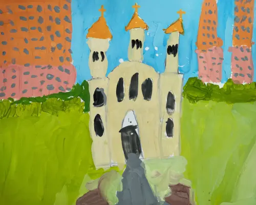 Храм Покрова Пресвятой Богородицы очень красивый. Можно погулять в парке или посидеть на скамейке рядом с храмом и послушать колокольный звон. Бумага, гуашь.