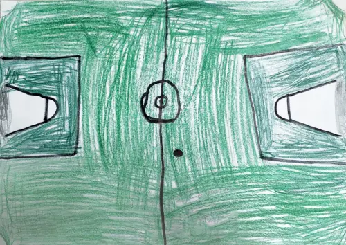 Я очень люблю заниматься футболом. Когда думал, что нарисовать, то решил изобразить футбольное поле, где я провожу много времени на тренировках по футболу.