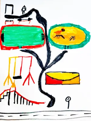 Я нарисовал свой двор. В моем дворе есть детская площадка, собачья площадка, где выгуливают собак. Еще есть спортивная площадка, где мы с ребятами играем в футбол.