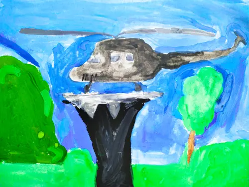 На рисунке изображён самый настоящий вертолёт, который установлен на улице Авиаконструктора Миля. Все ребята очень любят его рассматривать и мечтают когда-нибудь подняться на нём в воздух! Бумага, гуашь.