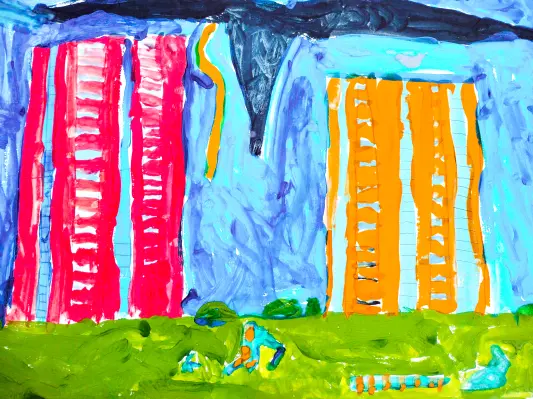 В Некрасовке началась гроза! Небо потемнело, его заволакивают серые тучи. Ребята разбежались по домам с детской площадки. И тут сверкнула молния и ударил гром! Бумага, гуашь.