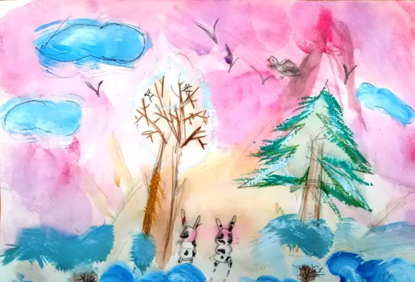 Недавно мы гуляли в парке, и неожиданно нам навстречу выбежали 2 зайца. Они очень нас испугались и убежали, а мне захотелось нарисовать их, чтобы не забыть нашу встречу.
