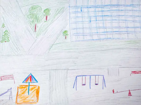 На моём рисунке изображен район Новокосино, в котором я проживаю с самого детства. Эта площадка в моем дворе. Я очень люблю кататься с горки, качаться на качелях и сидеть на лавочке! Люблю район Новокосино!