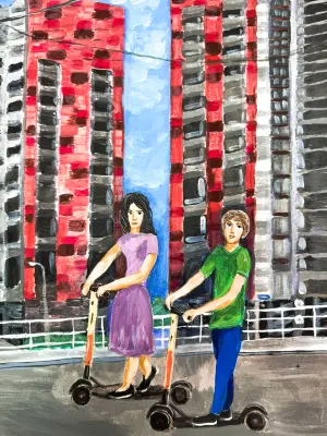 На рисунке я изобразила свой любимый район! Я живу в нем с детства и мне очень нравится! В моем районе очень много людей, которые катаются на самокатах и велосипедах, поэтому я нарисовала их!