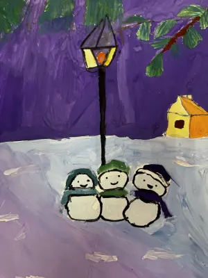 Я нарисовал свой дом зимой. Очень люблю лепить снеговиков, поэтому на рисунке у меня их целых три! Ещё люблю зимний лес и ёлки, которые очень вкусно пахнут.
