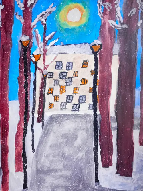 На рисунке я изобразила свой дом и свой двор на улице Боженко, дом 9. Я нарисовала дом, каким я вижу его зимой, когда иду с мамой вечером с кружка. В окнах теплится мягкий жёлтый свет, и я любуюсь, какой у меня красивый двор, и мечтаю, как хорошо мне будет дома. Я очень люблю мой район - Кунцево, и наш маленький уютный дом, которому уже больше 60 лет. Глядя на него, я каждый раз думаю о том, сколько жизней он видел и сколько тайн он хранит. Но в этот морозный вечер дом молчит и светит своими добрыми окнами-глазами.