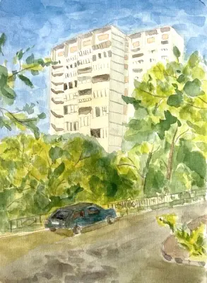 Выходя из школы искусств им. М.А. Балакирева, я обратила внимание на высокий панельный дом и тихий зелёный двор рядом с ним. Я часто слышала от родителей, что такие дома называют панельками. У них всегда так сильно выделяются швы и одинаково застеклены балконы. Но не смотря на это, такие дома ассоциируются с целой эпохой, с жизнью многих московских семей. Смотря на этот дом я решила нарисовать его, чтобы эта часть истории осталась в памяти у будущего поколения москвичей.