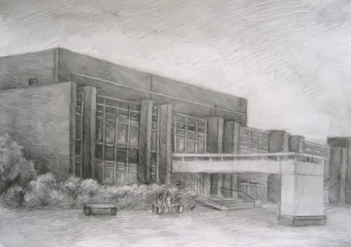 Графическая работа. Пленэрная работа. Изображено здание Дома Культуры при институте МИЭТ в городе Зеленограде. Отлично прорисованы линии здания и пасмурное небо.