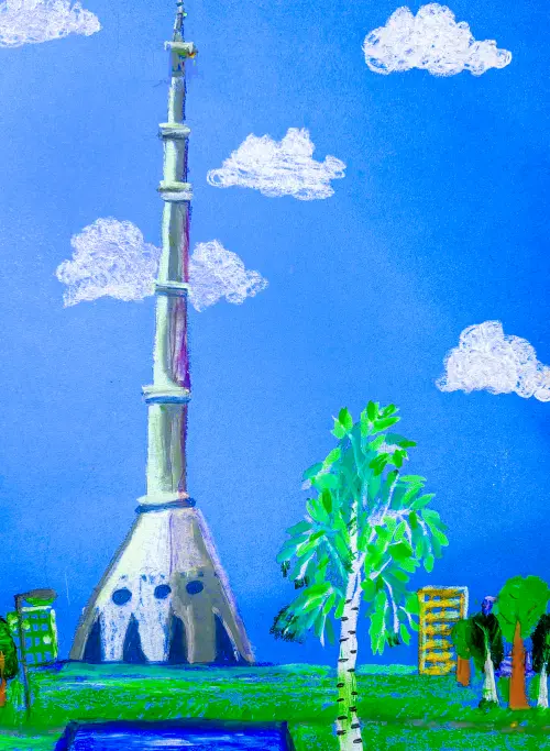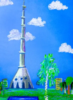Выходя на балкон, всегда смотрю на Останкинскую башню. В разную погоду она выглядит по-разному. А вечером она особенно красива, потому что горит разными огоньками. Поэтому я её нарисовал яркой пастелью.