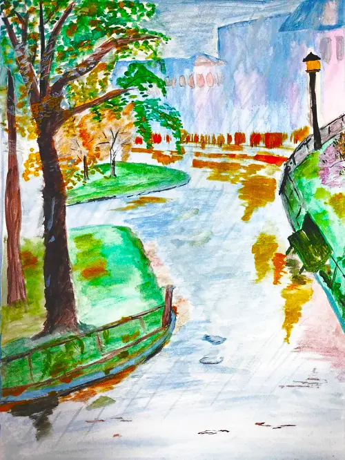 Часто гуляем в парке, и природа меня часто впечатляет. Как-то раз мы попали в дождливую погоду, и я решила нарисовать картину. Я пыталась показать, что природа красива в дождливую погоду и всегда завораживает.