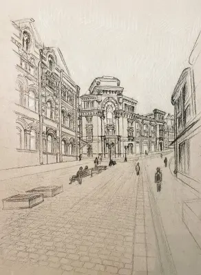 Мне нравятся улицы Москвы. В нашем районе тоже есть большие, широкие улицы. Хочу, чтобы в нашем районе тоже были мощеные улицы. Я нарисовал чудесную старую улицу.