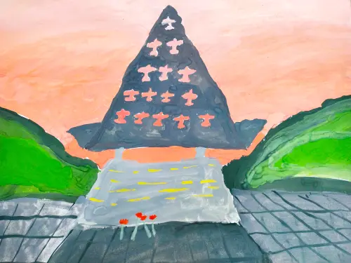 Памятник лётчикам-героям войны на фоне закатного неба. У подножия памятника лежат цветы, как знак вечной памяти о подвиге героев- защитников Отечества. Бумага, гуашь.