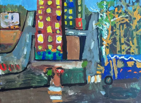 На рисунке изображено ЖК "Саларьево Парк", работа рисовалась в 5 лет. Холст, акриловые краски. На картине изображены любимый Электробус, первые дома и садик.