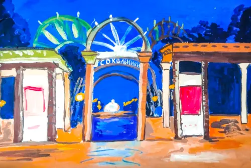 Парк «Сокольники» - душа нашего района. В нём восстановлена историческая входная группа - это визитная карточка парка, поэтому решение о том, какой именно любимый объект своего района нарисовать, не стоял ни минуты. Гуашь, формат а3.