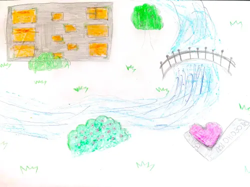 Очень люблю свой район, у нас в районе много парков и площадок,очень зеленый район. Я рада, что живу в этом районе. На картине я нарисовала пруд в Лианозовском парке.