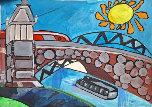 Московская транспортная сеть стремительно развивается. Особый акцент делается на модернизацию городского электротранспорта и увязке его в единую транспортную систему. Водные пути, Москва река, прежде всего, также становятся частью этой системы. Появляется удобный и экологически безопасный электрический речной транспорт. Вот эти впечатляющие изменения мне и захотелось изобразить. Живописный уголок, практически в самом центре города, там где Андреевский мост соединяет Фрунзенскую и Пушкинскую набережную, а скоростные электропоезда проносятся над рекой, где курсируют современные электрические речные трамвайчики.