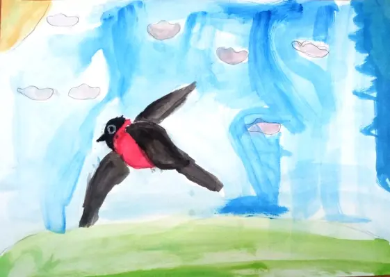 К нам во двор очень любят прилетать птицы, все они мне очень нравятся. Но особенно нравится снегирь — он очень красивый, и я захотела его нарисовать.