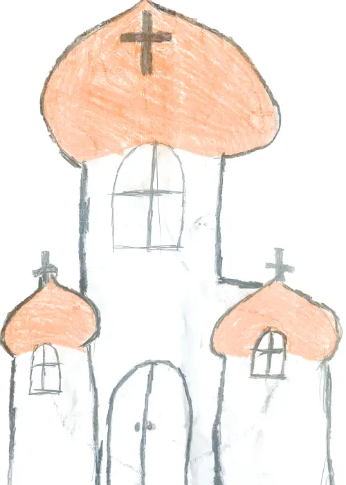 На рисунке – Храм Всемилостивого Спаса в Митино. Золотые купола сияют на фоне лазурного неба, отражая солнечный свет. Белые стены храма, украшенные арками и резными элементами, кажутся легкими и воздушными. Вокруг храма – зеленая трава и молодые деревья, создающие ощущение покоя и умиротворения. Вдалеке виднеются очертания жилых домов, напоминая о близости к городу. Общее впечатление – красота и гармония, духовность и связь с окружающим миром.