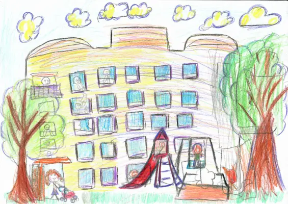 Около нашего дома замечательная площадка — городок. Мы очень любим играть на ней. Все мои друзья приходят играть сюда. Тут есть горка, песочница, качели. Кругом растут деревья.
